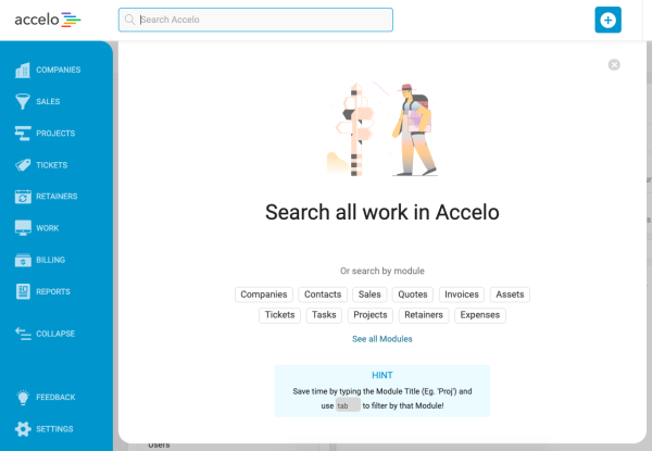 Navigating through the various pages of Accelo can be done using the Module pop-out menus on the left side of each page, and tools found at the top of the page.