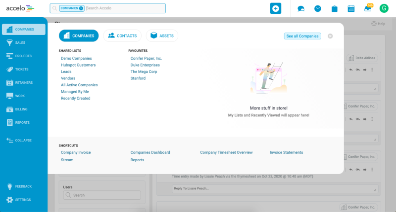 - Reports - The Reports pop-out menu gives Users a view at the Dashboards and dynamic Reports that pull from your Accelo data.