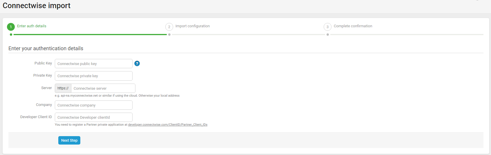 On the first step of the Connectwise Import, enable your authentication details by entering your Public Key, Private Key, Connectwise Server, Connectwise Company Name, and Developer Client ID. This is not your normal login, it is the Integrator login account (see above). Click the Next Step button when you're ready.