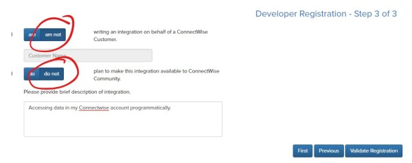 After you accept the Terms and Conditions as a Partner (recognizing that the API is not supported), you have one last screen where you make it clear that your role as a developer is just for your own purposes and you won't be trying to publish anything to the Connectwise community.