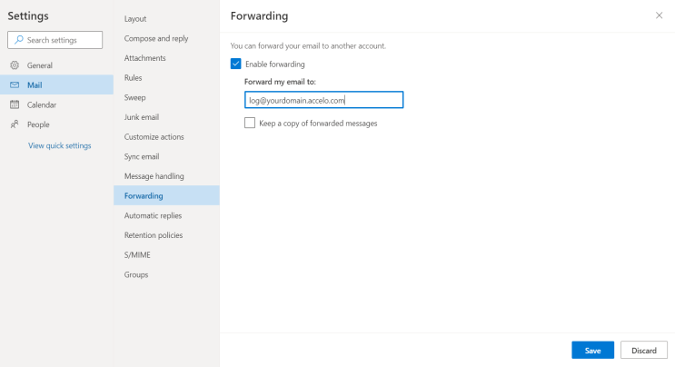 Next, enter your log@yourdomain.accelo.com in the Forward my email to field.