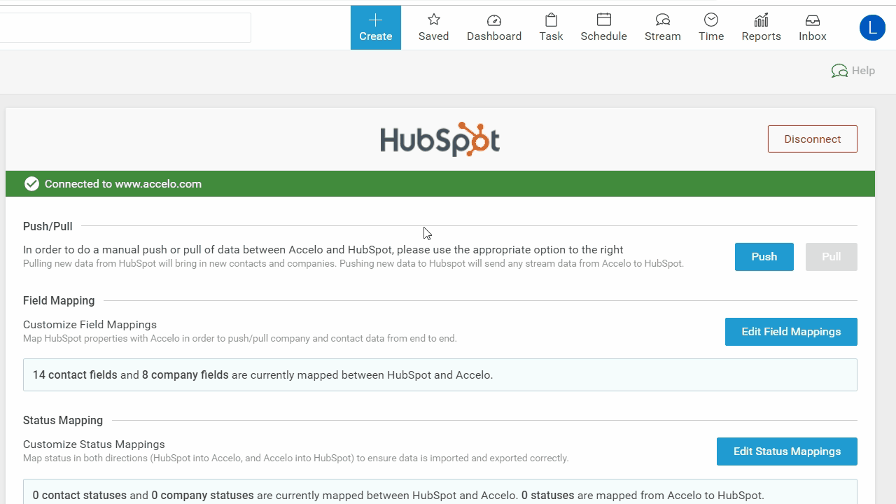 The HubSpot Sync Log records the details of all of the information which syncs between Accelo and HubSpot, and is a great tool for monitoring what information has been updated by the routine sync, and for identifying records which have not synced.