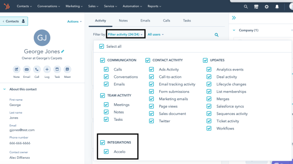 NOTE: In order for Accelo Objects to be shown as HubSpot Timeline Events, you must check the Accelo checkbox under the Integrations section of your filters in HubSpot.
