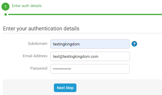 Enter your Zendesk Subdomain, Email Address, and Password. Note that your Subdomain is the portion of the URL after the "https://" and before ".zendesk.com". Click Next Step.