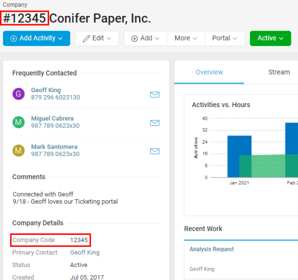 You can find this Company code within the Client Name and under Client Details. If you do not want it within the Company name, you can configure it to not show up. If it is configured to be shown within the Company name, this will show up everywhere the Company Record is mentioned in Accelo.