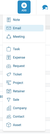 Click +Add button and choose either Note, Email or Meeting. (The option to select Postal is selected at the next step.)