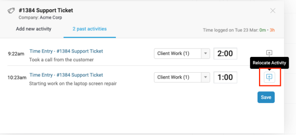 After clicking on Relocate, you will see a list of places where you can move the Activity. Click the Tab to associate it with the right Sale, Ticket, Retainer, Project, etc.