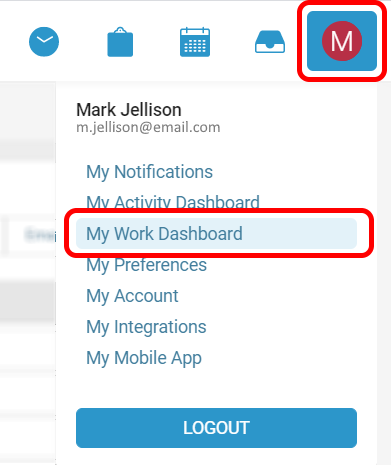 To navigate to your My Work Dashboard, hover over the Dashboard icon in the top menu and click on My Work Dashboard.