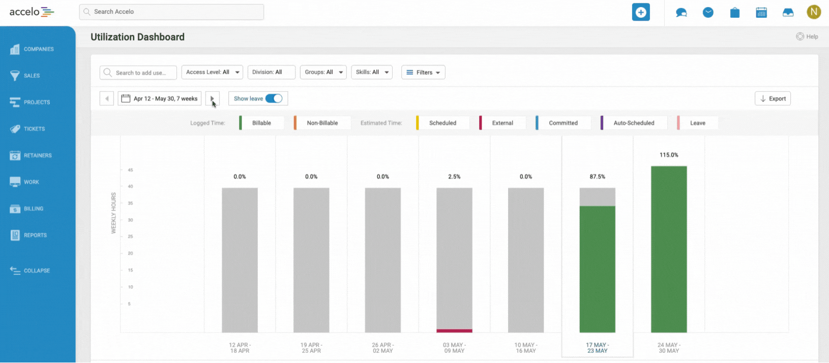 Once you add the appropriate users to the Dashboard, you will be able to view how they are being utilized in the platform through a bar graph of their time logged and scheduled. You will see this graph displayed as a bar for each week, with seven weeks viewed at a time.