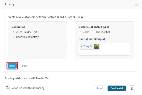A secret relationship means that the relationship with this contact/company is completely private. Any communication between you and this contact will be completely hidden from view for all other users. This setting is ideal when you frequently interact with a contact on non-business matters and would by default like the activities to be completely hidden to everyone else. You can individually remove the private flag from an activity if it happens to be business related.