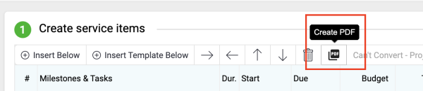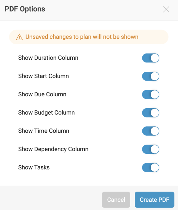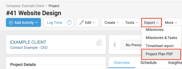 The Export > Project Plan PDF option can be used to export the Gantt chart view of your Project to a PDF file, perfect for sharing with your customers and wider team. Simply click the option found under Export > Project Plan PDF or Create PDF icon (when in the Edit Plan view)