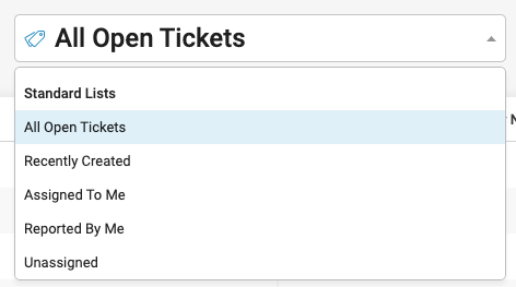 By default, the Ticket list shows Tickets with a Standing of Submitted, Open, or Resolved. Use the filters at the top of the list to sort the Tickets.