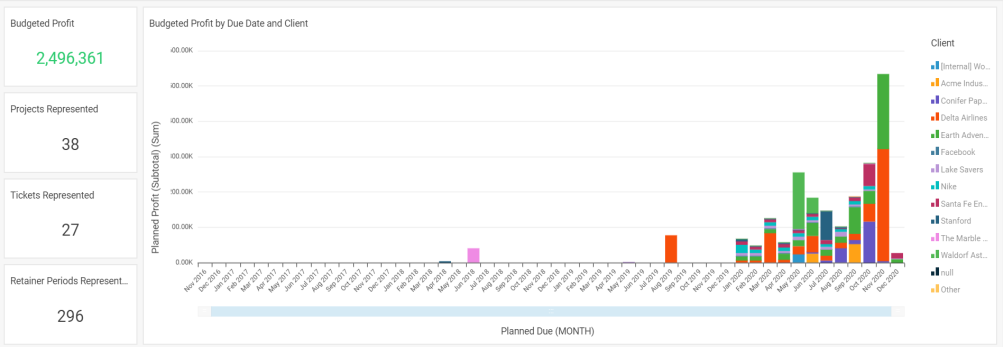 Many organizations set their prices with a low profit margin, with the goal of establishing an ongoing relationship with their client that will lead to more revenue in the long term. It's therefore important for these organizations to be able to evaluate their profitability on a client-by-client basis, and to do so using a long time span. This report looks at profitability based on what was budgeted.