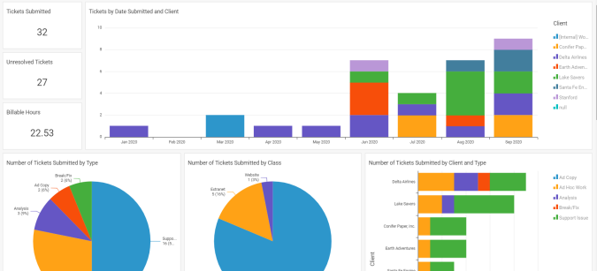 Similar to the Client Sales and Client Projects reports, Client Tickets contains important Ticket details, summarized by the client they are for. This will be especially important for Tickets, since they are created at a much higher volume and Sales or Projects.