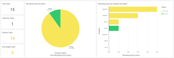 Monitor your team's usage of their task budgets, based on the hours budgeted for the tasks, and the billable hours logged.