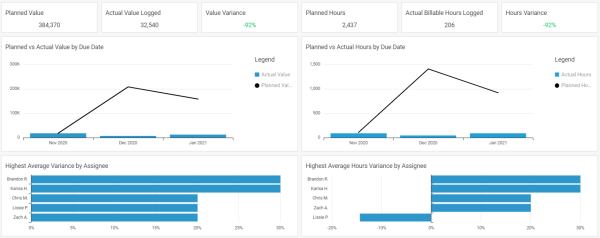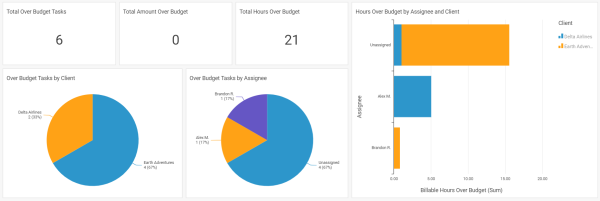 In the same vein as the Overdue Tasks Report, the Tasks Over Budget Report can be used for managers to review their team's over-budget Tasks. That way, you can ensure the work your team is performing is on budget, and you can take appropriate action if someone is struggling to stay on track.