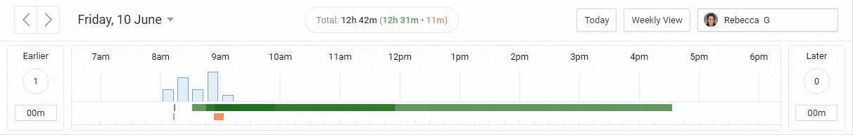 Billable activities (green bars): Any activities which have billable time are plotted underneath the histogram. The length of each rectangle represents the duration. If you notice different shades of green, this indicates there are billable activities overlapping each other. Mouse-over a block to see the time spent.