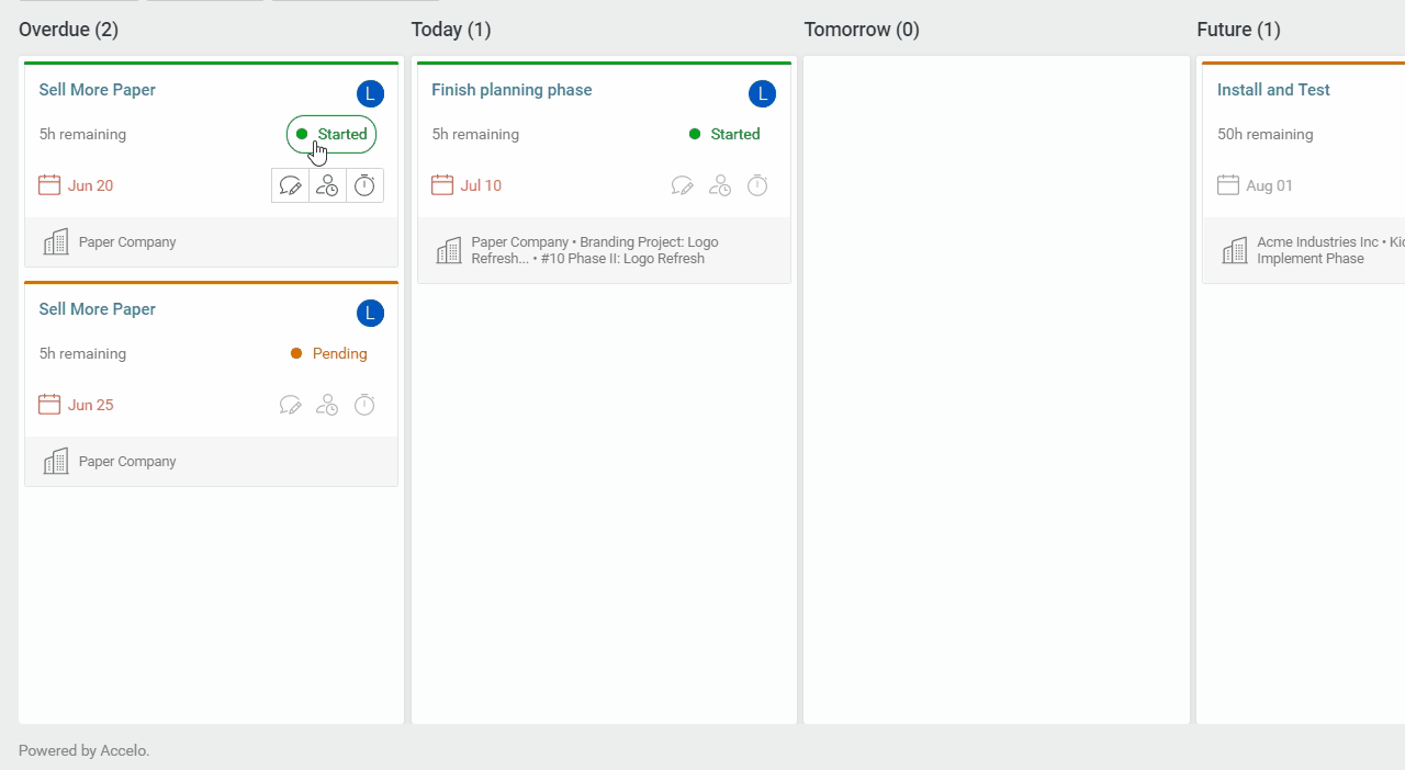 Status Task Board: View all assigned Tasks sorted into columns by their status. Your tasks are sorted by those you have not yet reviewed (Pending), have seen but not you started working (Accepted), are actively working on (Started), and those you have completed (Completed). Drag and drop the Tasks into different columns to change their current status. If you’ve been logging your time but forget to change the status of your tasks, clean your Task Queue by dragging your completed tasks over to the “Complete” column.